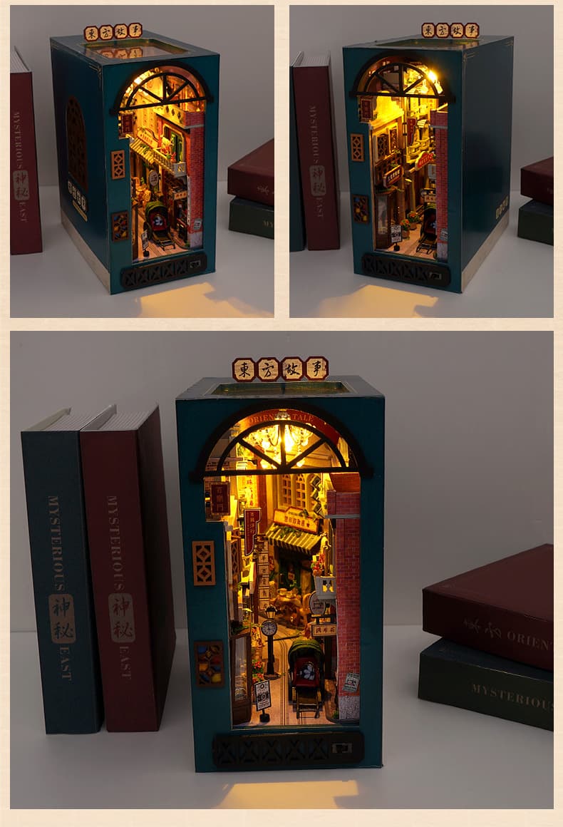 Книжный румбокс «Восточные истории» — это миниатюрный сказочный мир, который уютно размещается прямо на полке среди книг. Его сборка превращается в увлекательный и расслабляющий процесс, которым можно наслаждаться в одиночку или вместе с близкими. Детали выполнены из натуральных материалов, а теплая подсветка создает атмосферу старинной восточной улочки и делает румбокс стильным ночником. Это оригинальный подарок, который подарит эмоции и вдохновение как взрослым, так и детям.